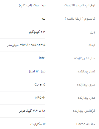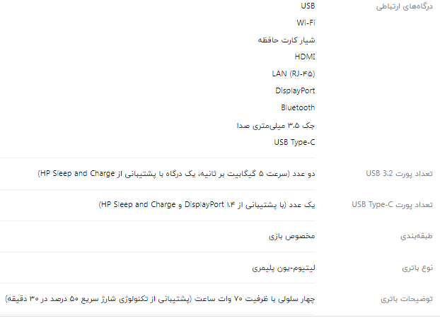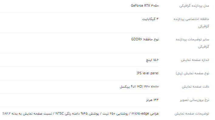 لپتاپ Victus Gaming 15-fa0033dx یکی از گزینههای میانرده و اقتصادی برای علاقهمندان به بازیهای ویدیویی محسوب میشود. بدنه از طراحی شیک و ظریفی برخوردار است و در مجموع 2.3 کیلوگرم وزن دارد. صفحه نمایش 15.6 اینچی این لپتاپ از پنل IPS با رزولوشن Full HD (1920 x 1080) بهره میبرد. نرخ بهروزرسانی 144 هرتزی، روشنایی 250 نیت و پوشش 45% فضای رنگی NTSC از دیگر ویژگیهای صفحه نمایش این مدل هستند. برای این مدل از پردازنده مرکزی Core i5 12450H استفاده شده که 8 هسته و 12 رشته دارد. این پردازنده دامنه فرکانس 1.2 تا 4.4 گیگاهرتزی و 12 مگابایت حافظه کش دارد. در کنار پردازنده قدرتمند نسل 12 اینتل، پردازنده گرافیکی GeForce RTX 3050 قرار گرفته است که به 4 گیگابایت حافظه اختصاصی مجهز شده. باتری چهار سلولی با ظرفیت ۷۰ وات ساعت، کیبورد با نور پس زمینه تک رنگ و استفاده از سیستم عامل Windows 11 به صورت پیش فرض از دیگر ویژگیهای قابل توجه این لپ تاپ هستند.
